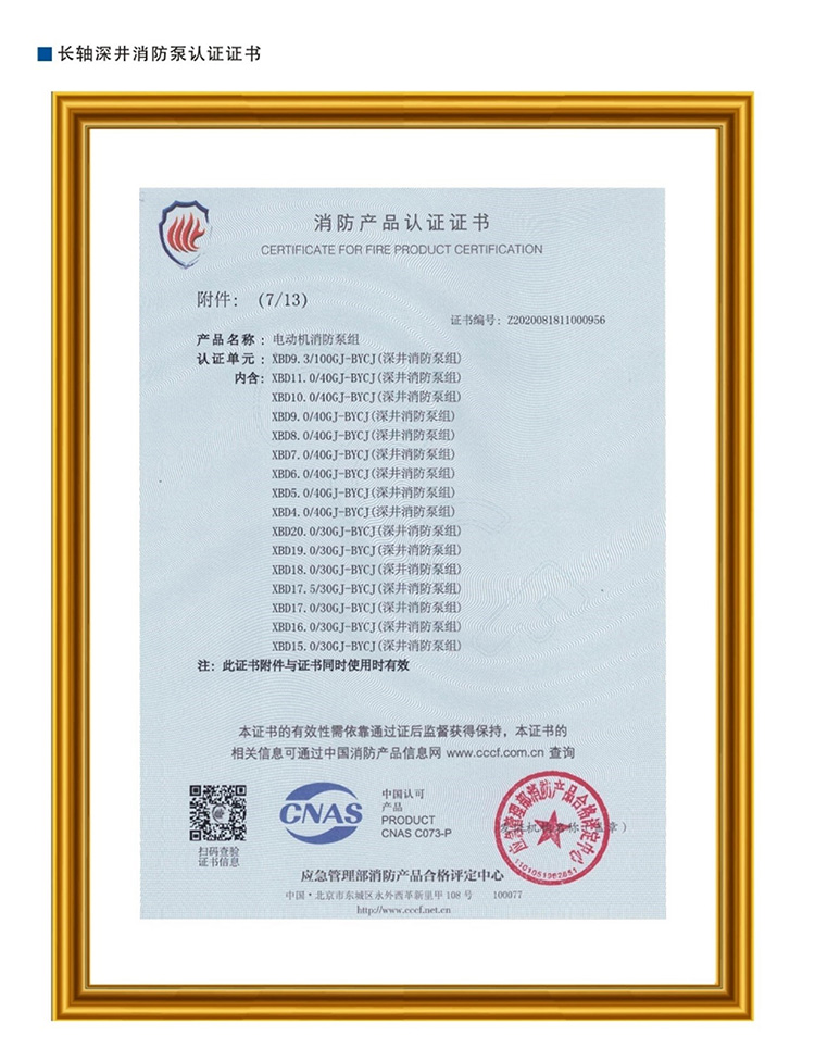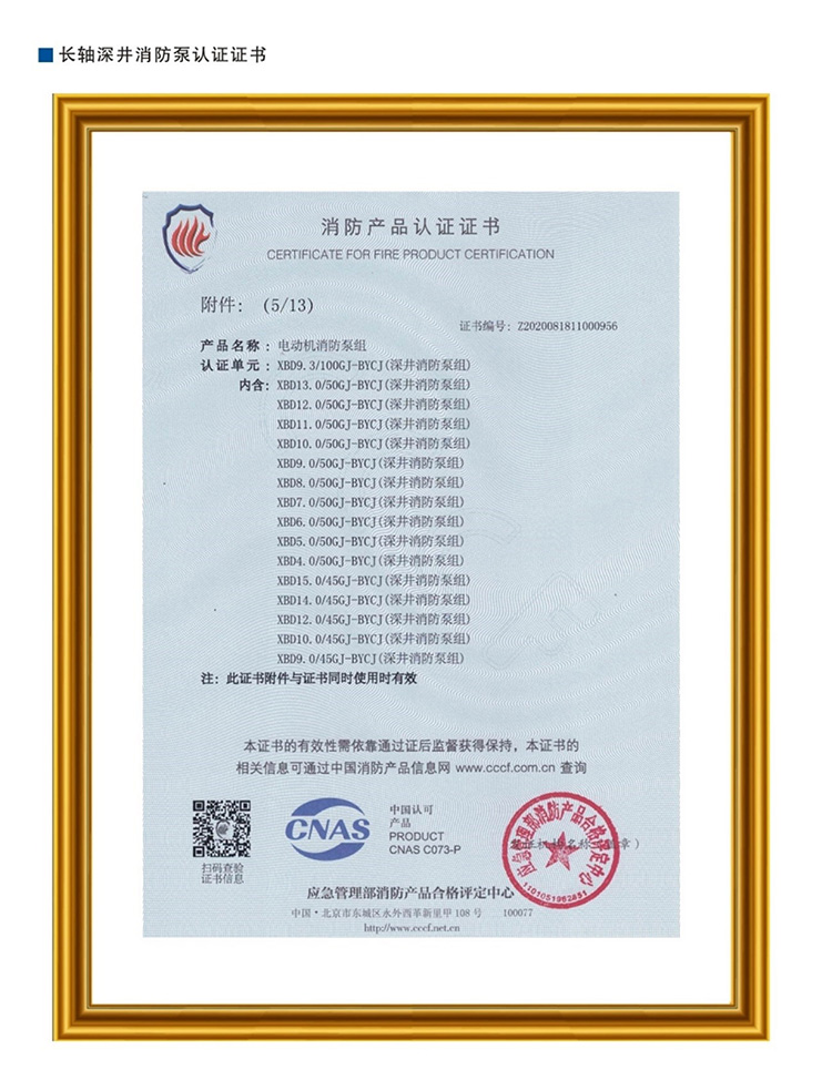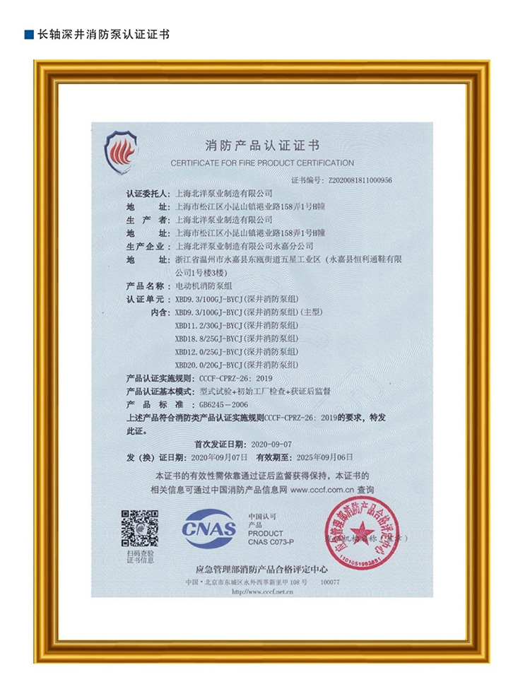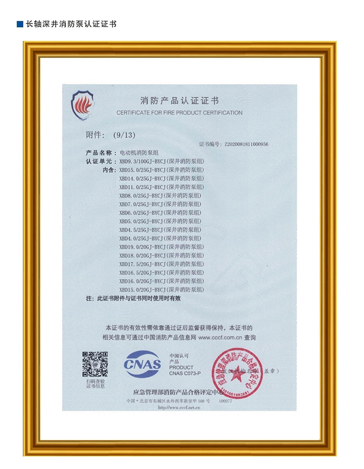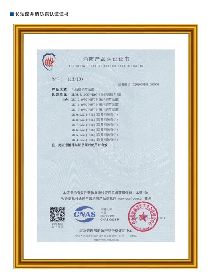 长轴深井消防泵认证证书