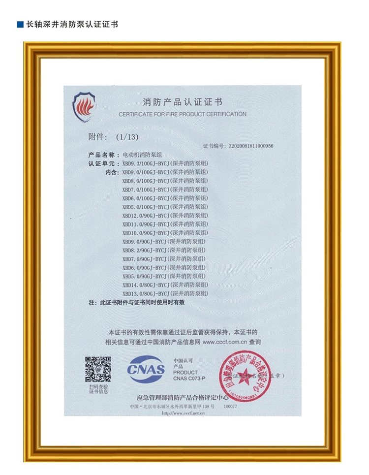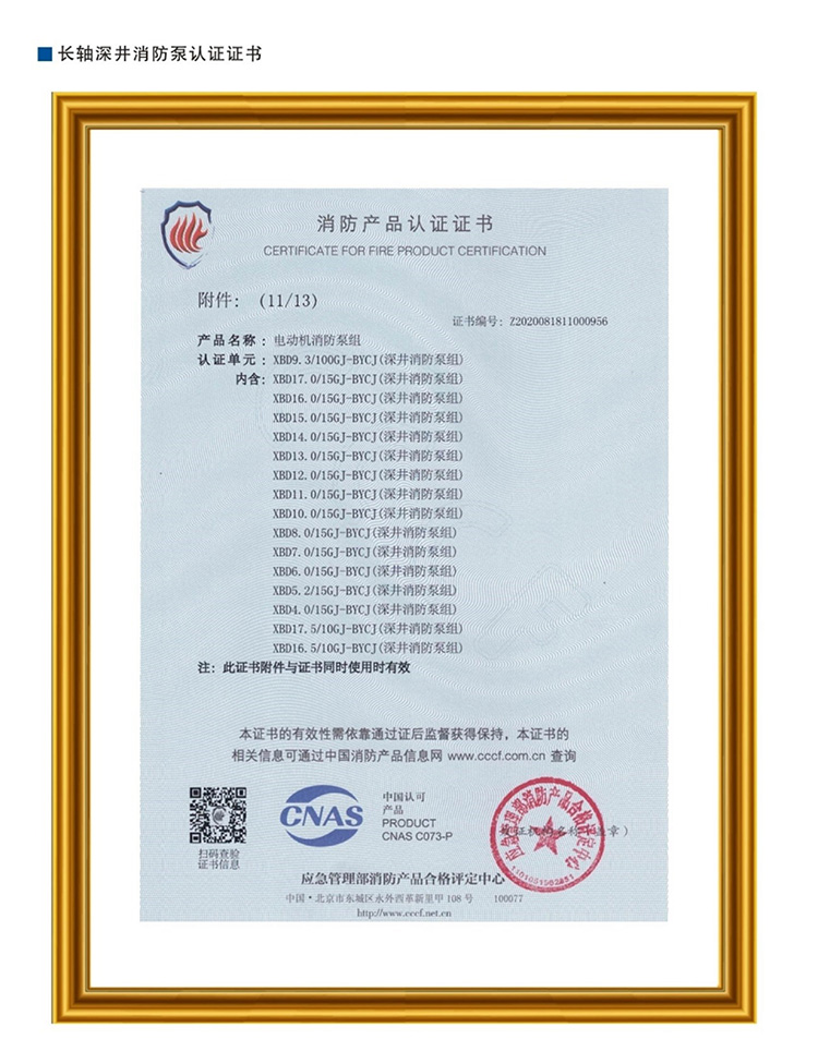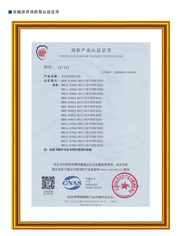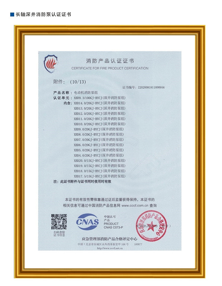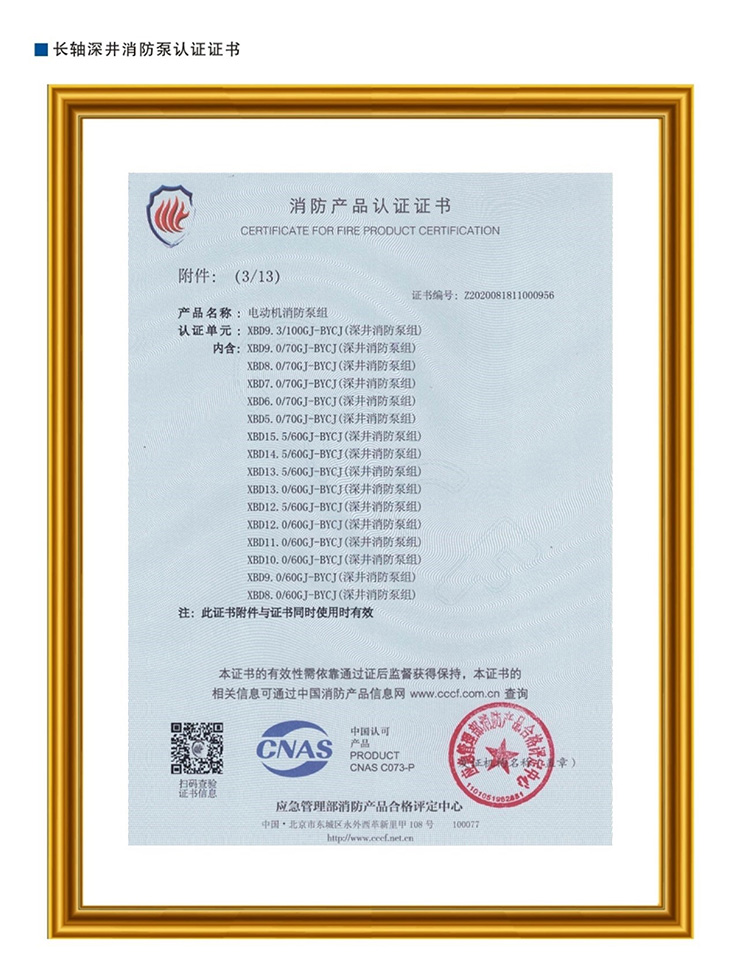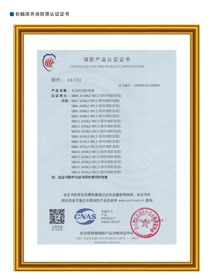 长轴深井消防泵认证证书